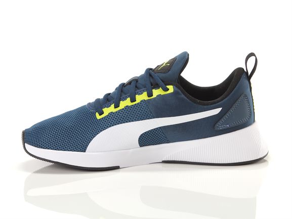 Sneaker puma petrolio, bianca e gialla fluo; scarpa running Flyer, tomaia in mesh traspirante, interno in mesh, esterno in tessuto tecnico ,suola in gomma, l'intersuola leggera e l'aggiunta del sostegno sul tallone avrai il perfetto stile a ogni passo.