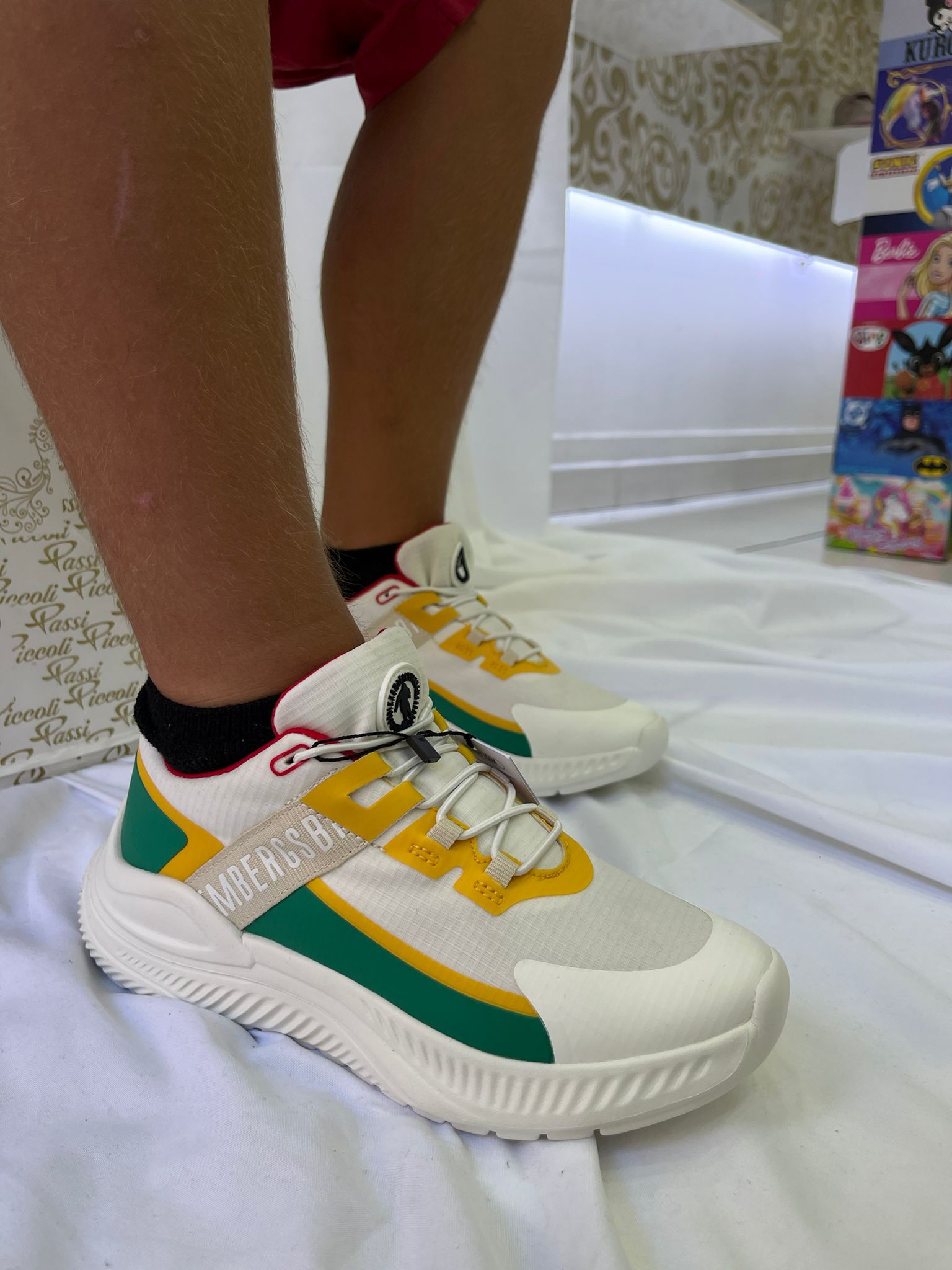 Sneakers bassa con fondo bianco. Giochi di colore tra il giallo,verde e rosso. Logata in bianco lateralmente. Chiusura con finto laccio. Gomma platform bianca.