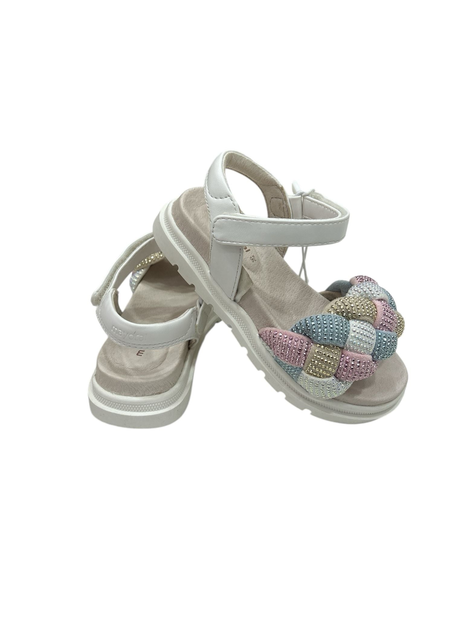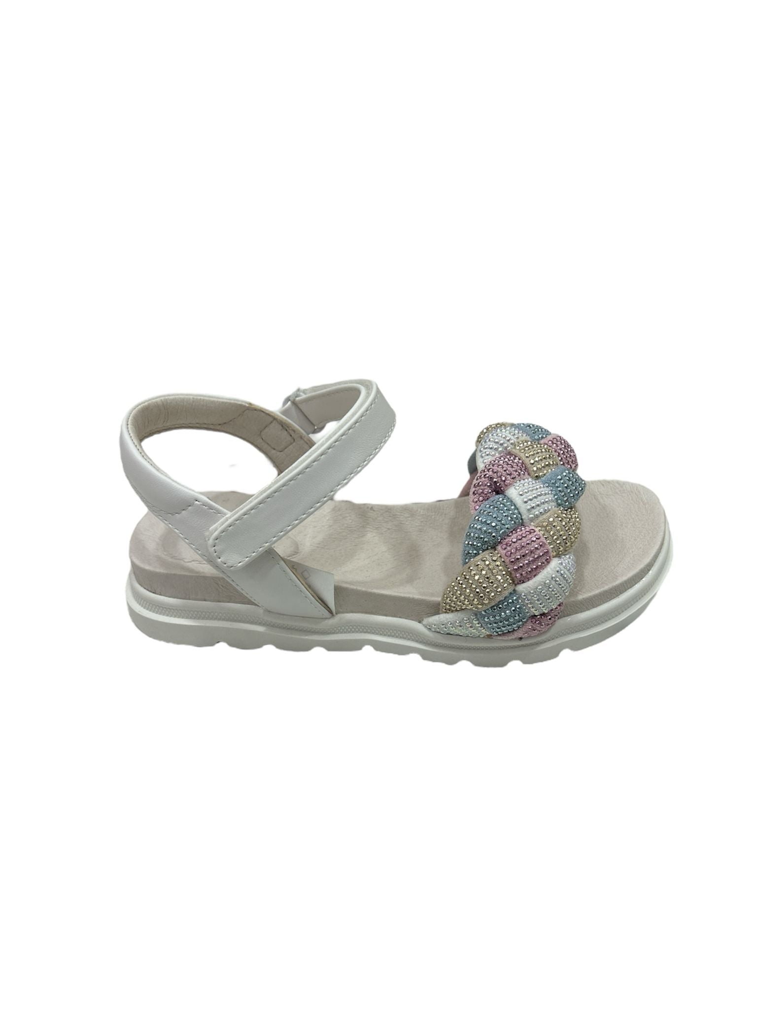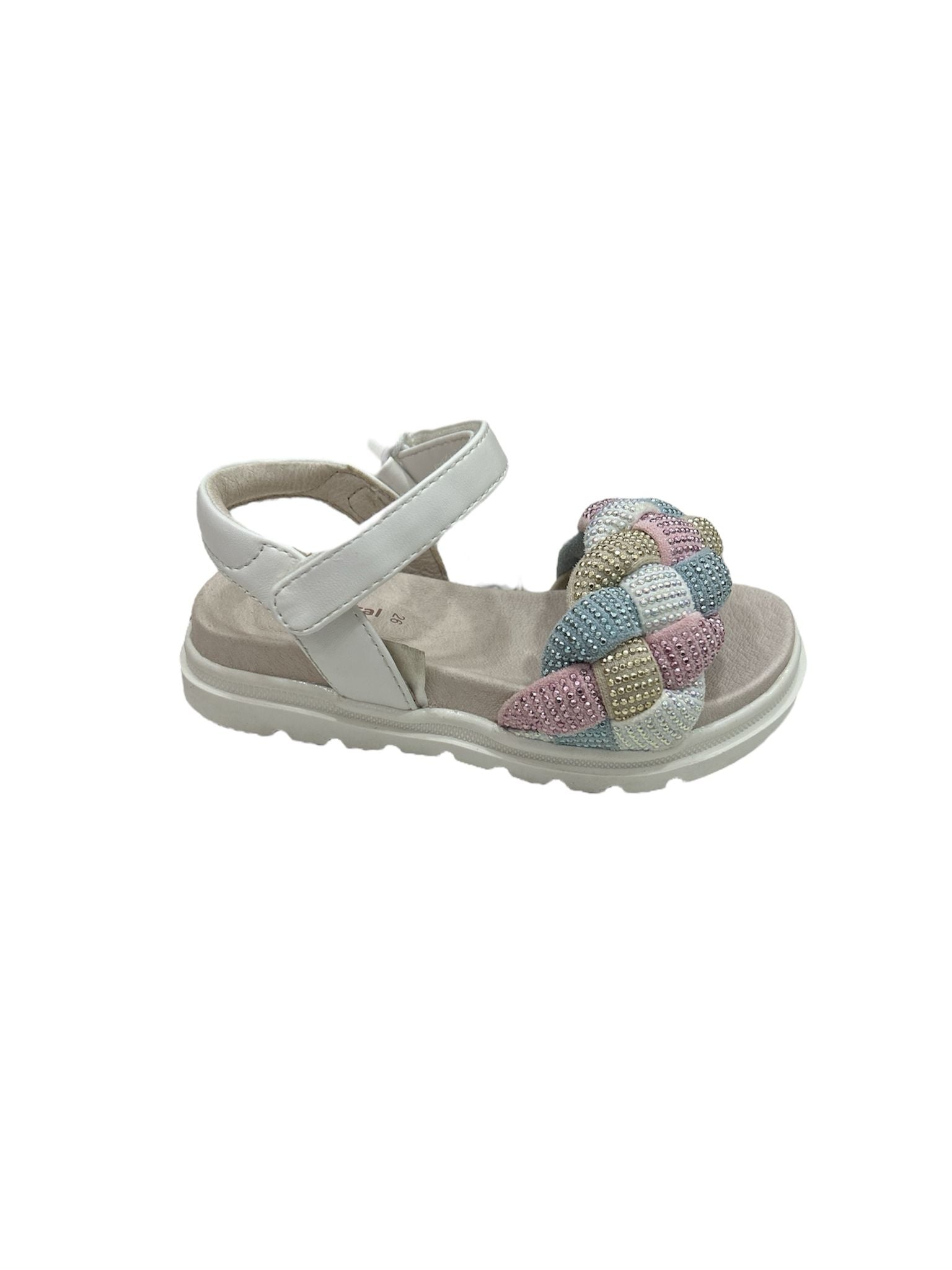 sandalo in pelle panna, chiusura con velcro e fascia intrecciata e brillantinata arcobaleno, suola in gomma per renderla più sportiva