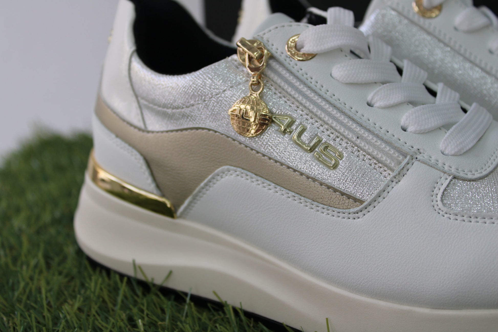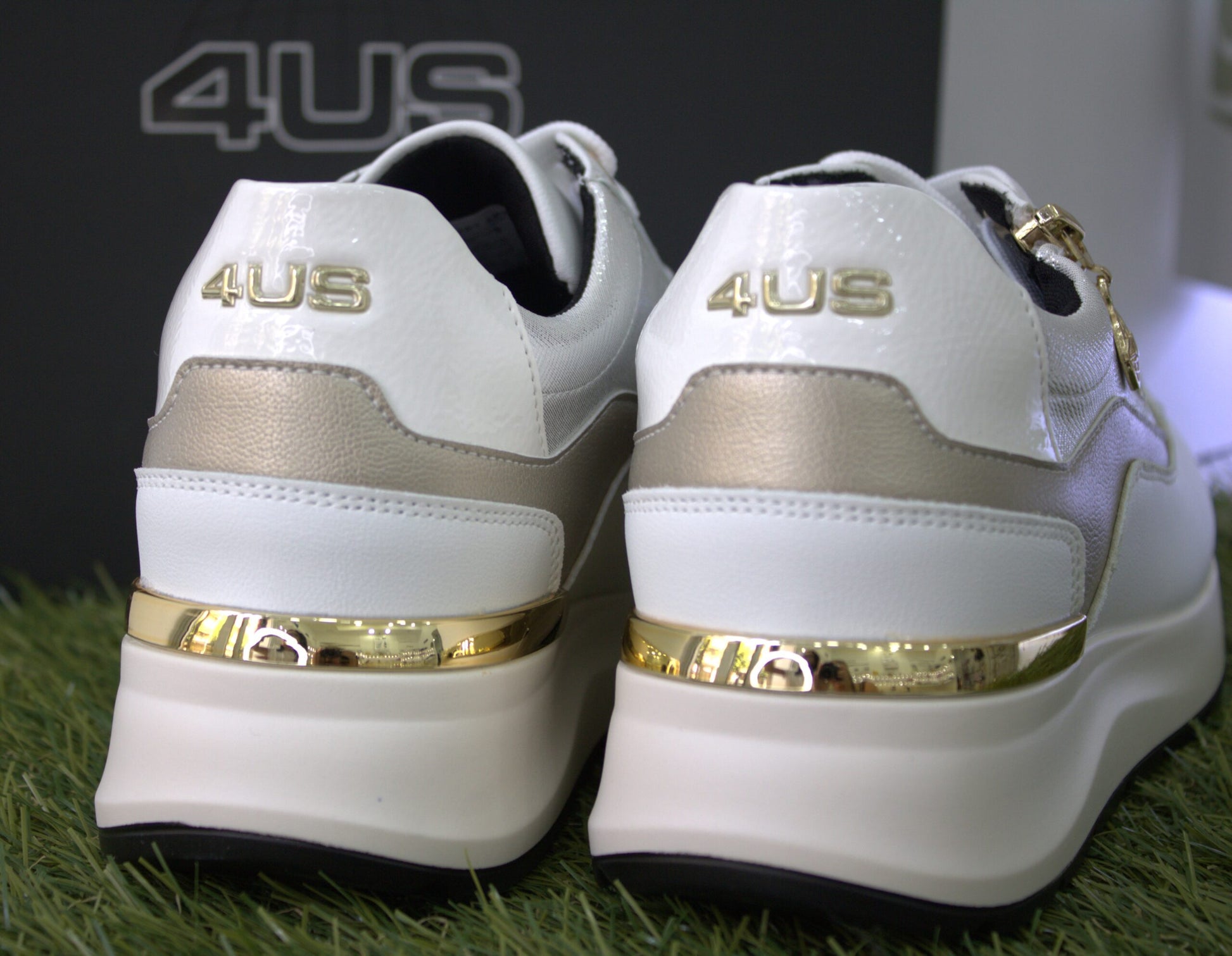sneakers 4us donna, tomaia in pelle bianca. Dettagli in oro e beige