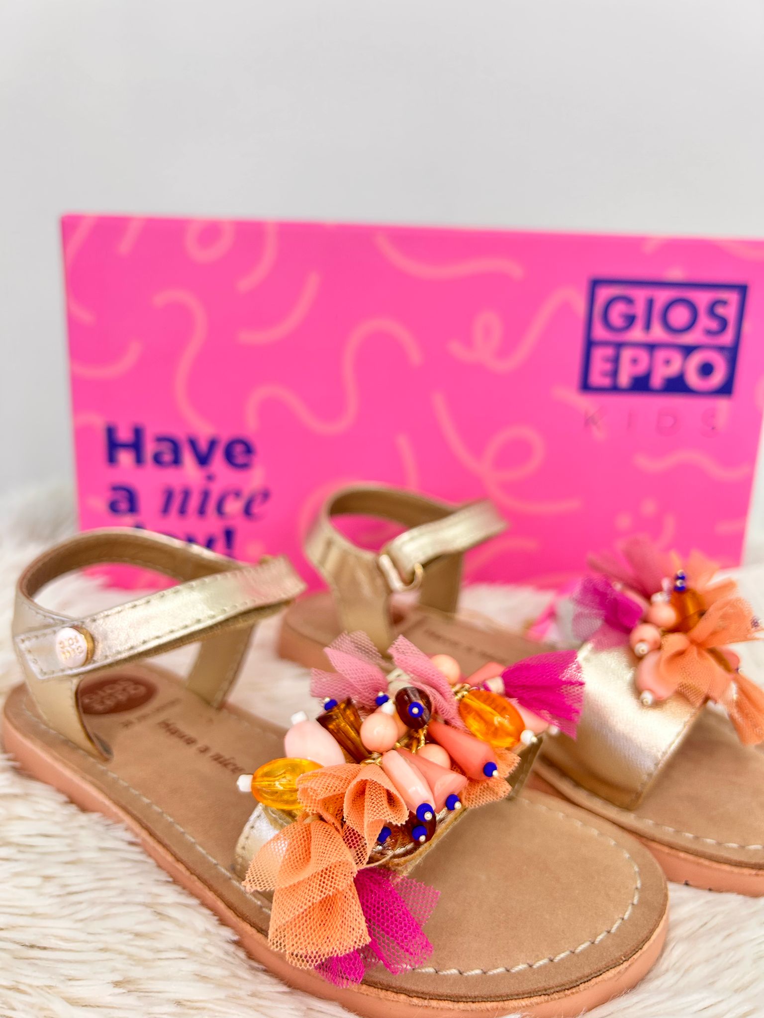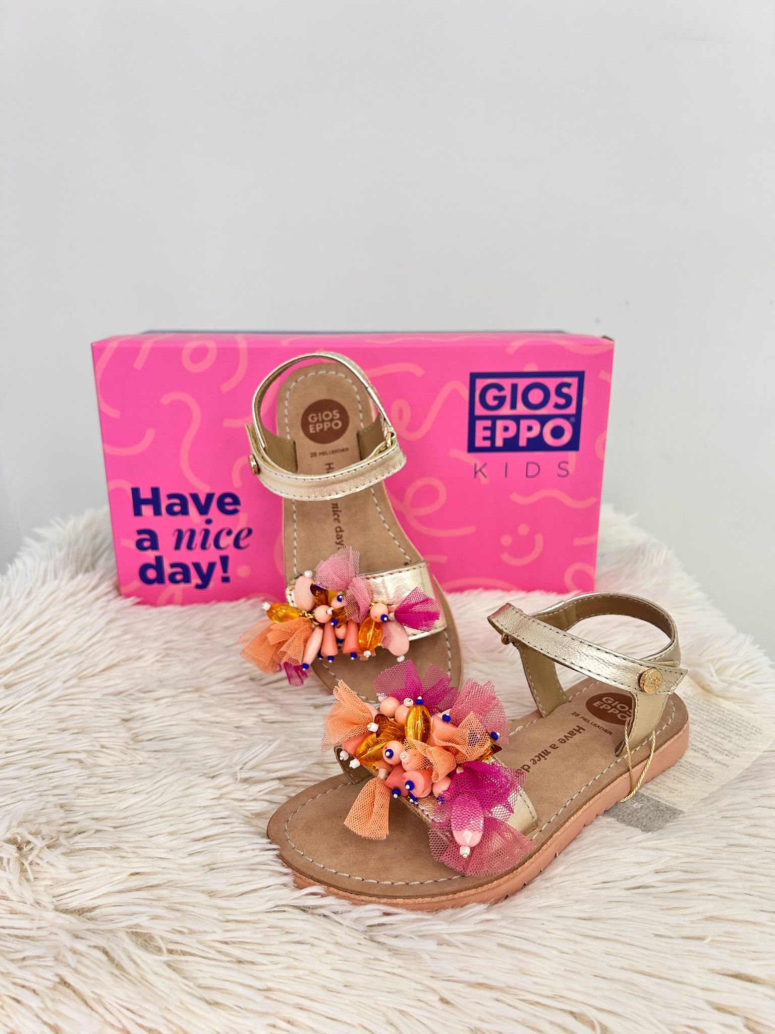 Sandali in pelle metallizzata con tulle e rifiniture in perline. Hanno una suola morbida e imbottita in pelle scamosciata. Chiusura regolabile alla caviglia. Composizione: -Tomaia e fodera in pelle. -Suola flessibile in TPR