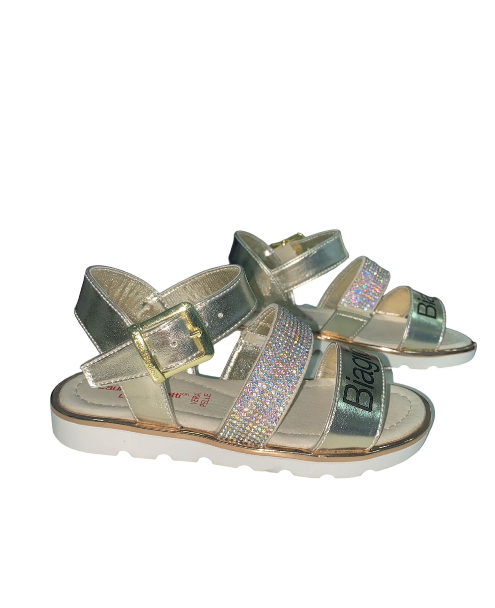 sandalo laura biagiotti , tomaia in pelle oro, chiusura in fibbia, logo sulla fascia sul davanti e fascia centrale brillantinata