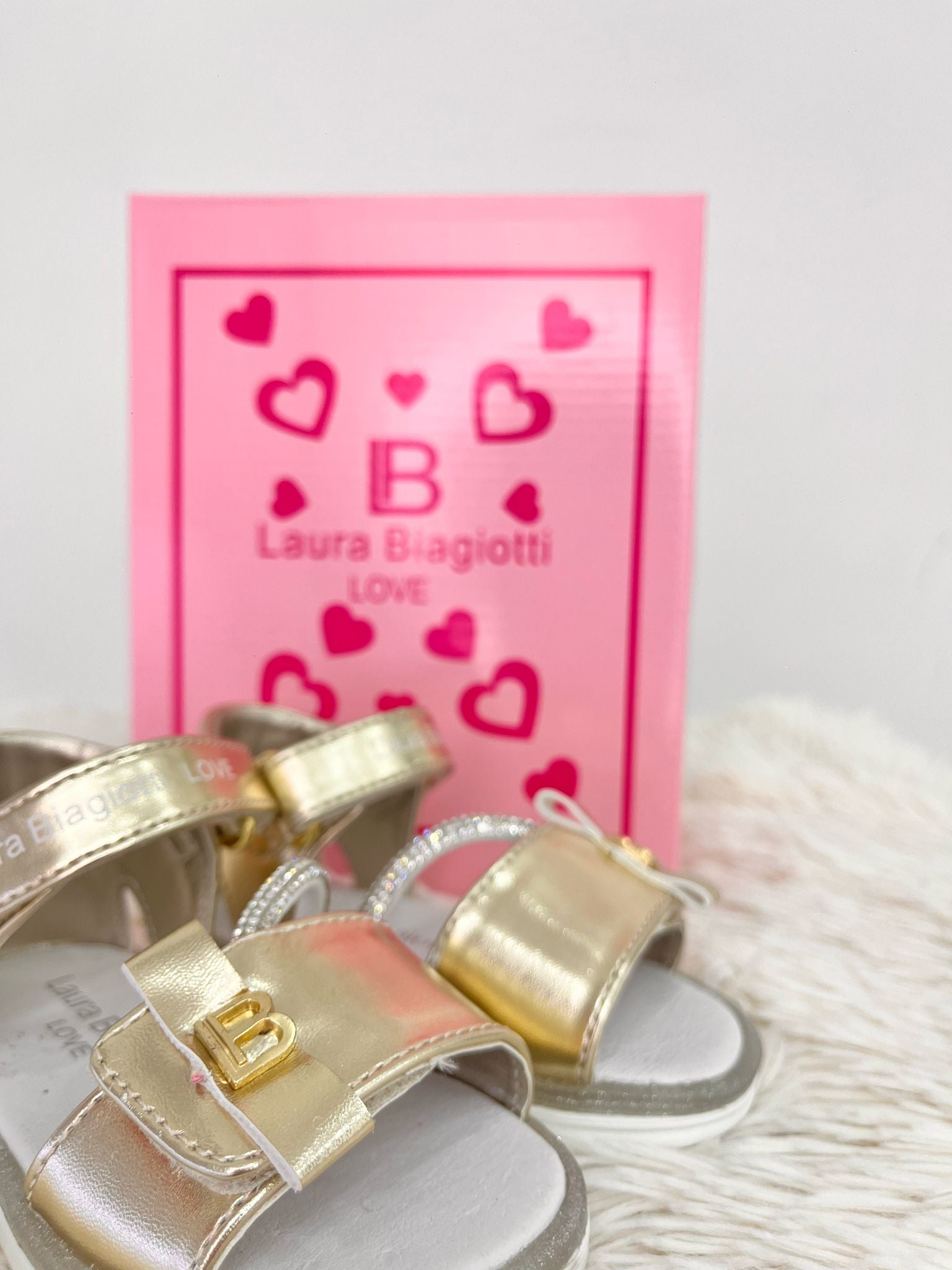 sandalo baby in pelle oro, chiuso sul retro, chiusura con velcro alla caviglia logato Laura Biagiotti, velcro sul davanti con fiocchetto e fascia brillantinata