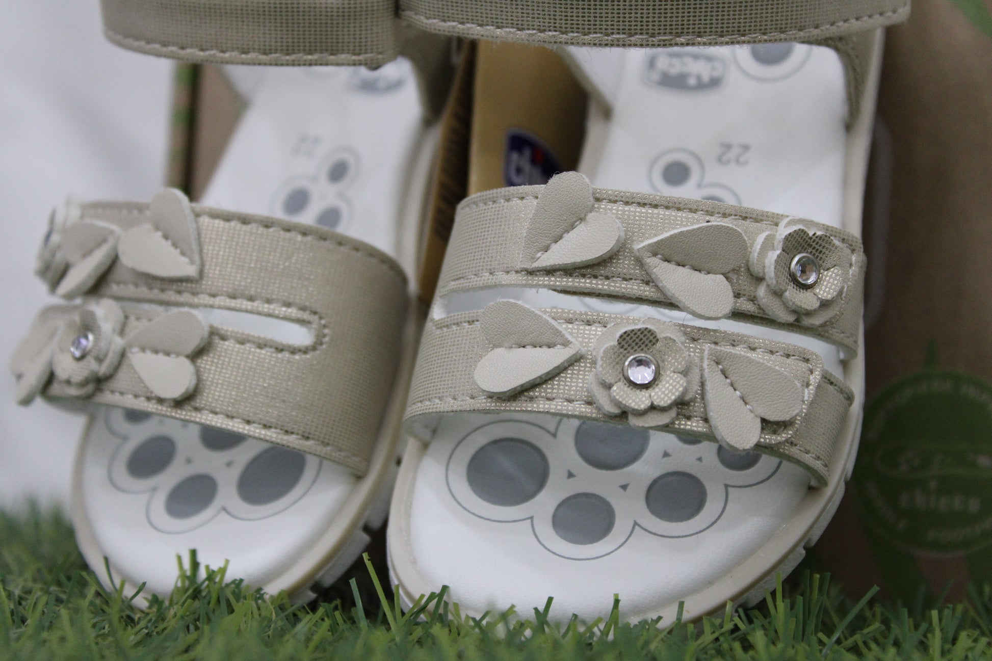 sandalo in pelle beige, fascia con foglie con velcro e chiusura alla caviglia con velcro
