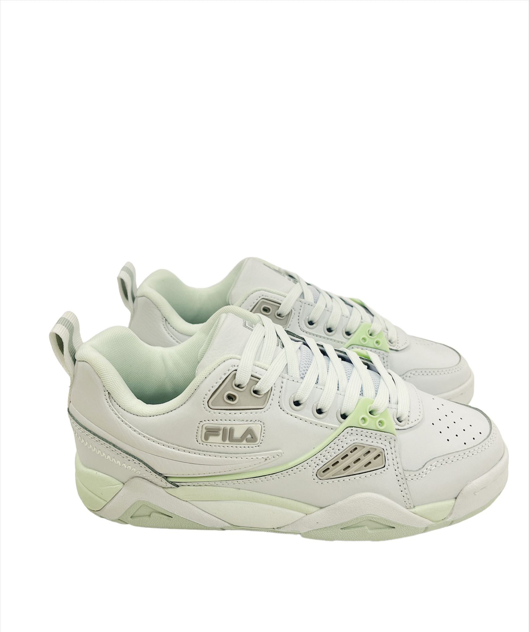 Sneakers 'Casim' bianche e verdi di Fila. Realizzata in pelle, questo modello stringato poggia su una suola in gomma verde e bianca e presenta elementi rifrangenti, inserti decorativi in gomma, punta traforata e logo frontale, laterale e posteriore.