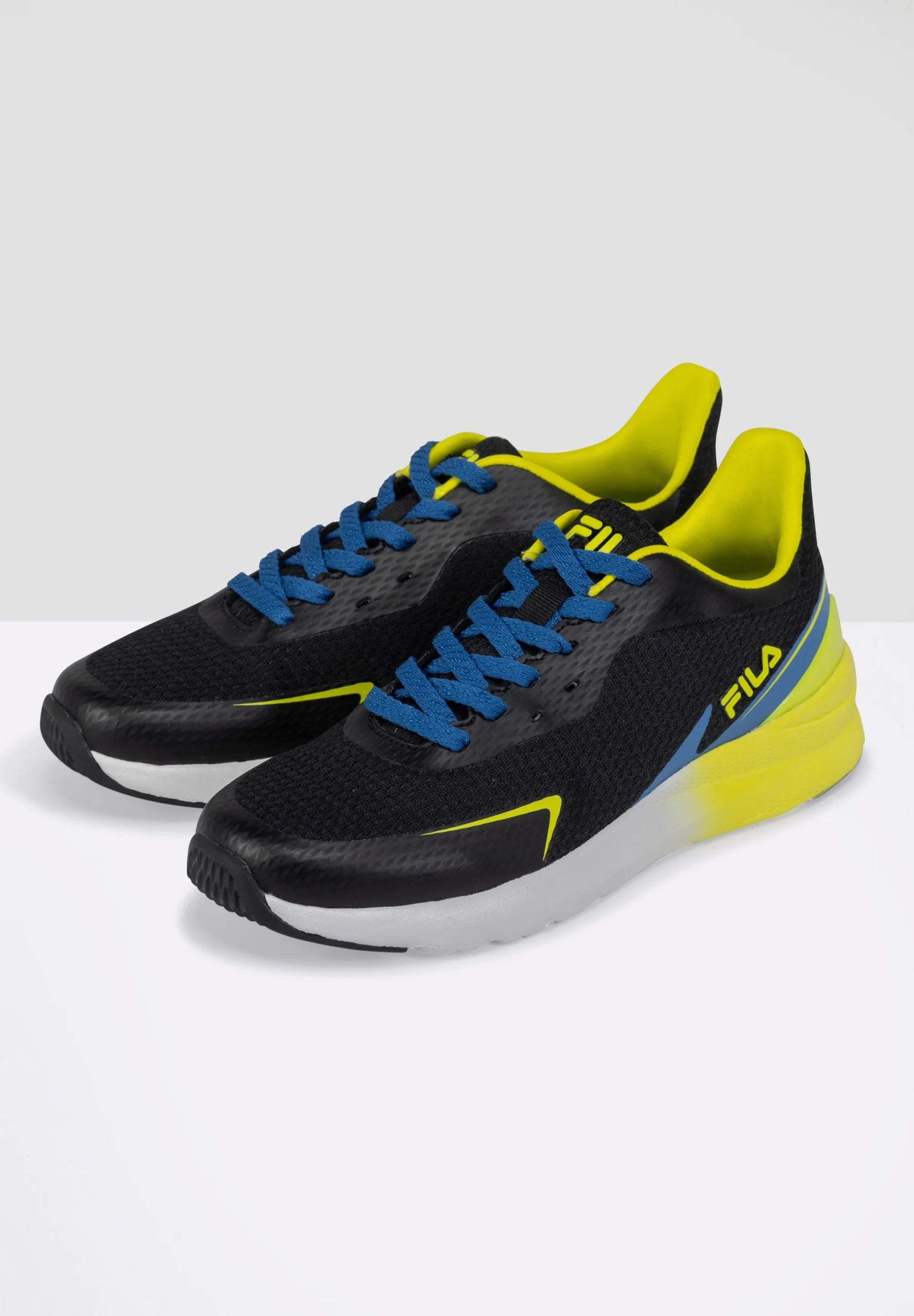 SNEAKER FILA, TOMAI AIN TELA NERA CON GIOCHI DI COLORI GIALLO E BLU. CHIUSURA STRINGATA