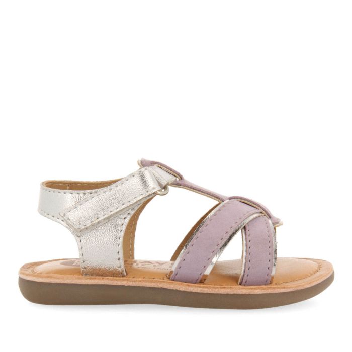 Sandalo in velluto color lilla sulla tomaia. Tallone metalizzato e cinutrino regolabile . La soletta è in pelle imbottita ,la fodera è in pelle e la suola è flessibile