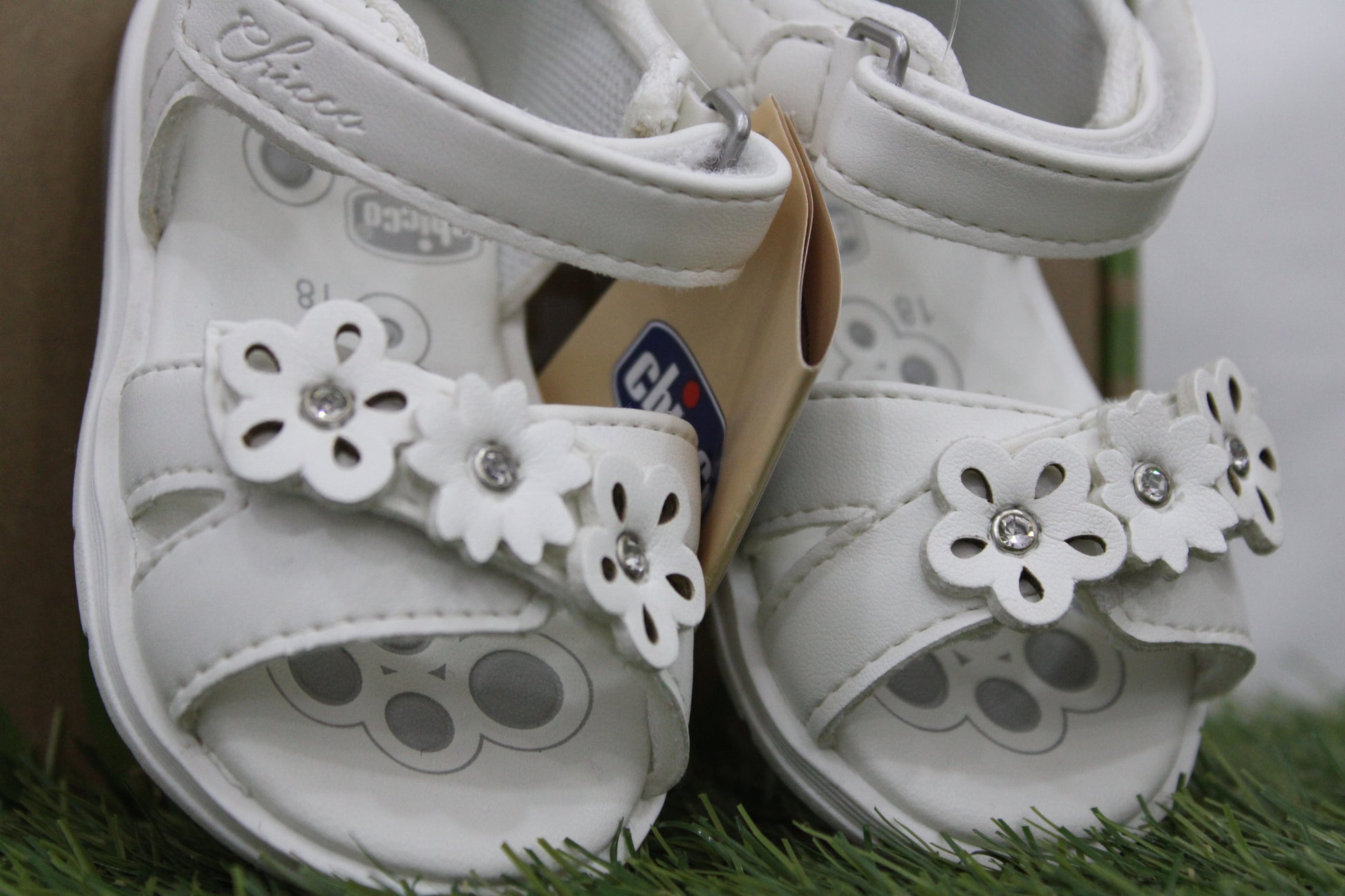 sandalo in pelle bianco, fascia ad intreccio con 3 fiorellini, chiusura alla caviglia con velcro, chiuso posteriormente