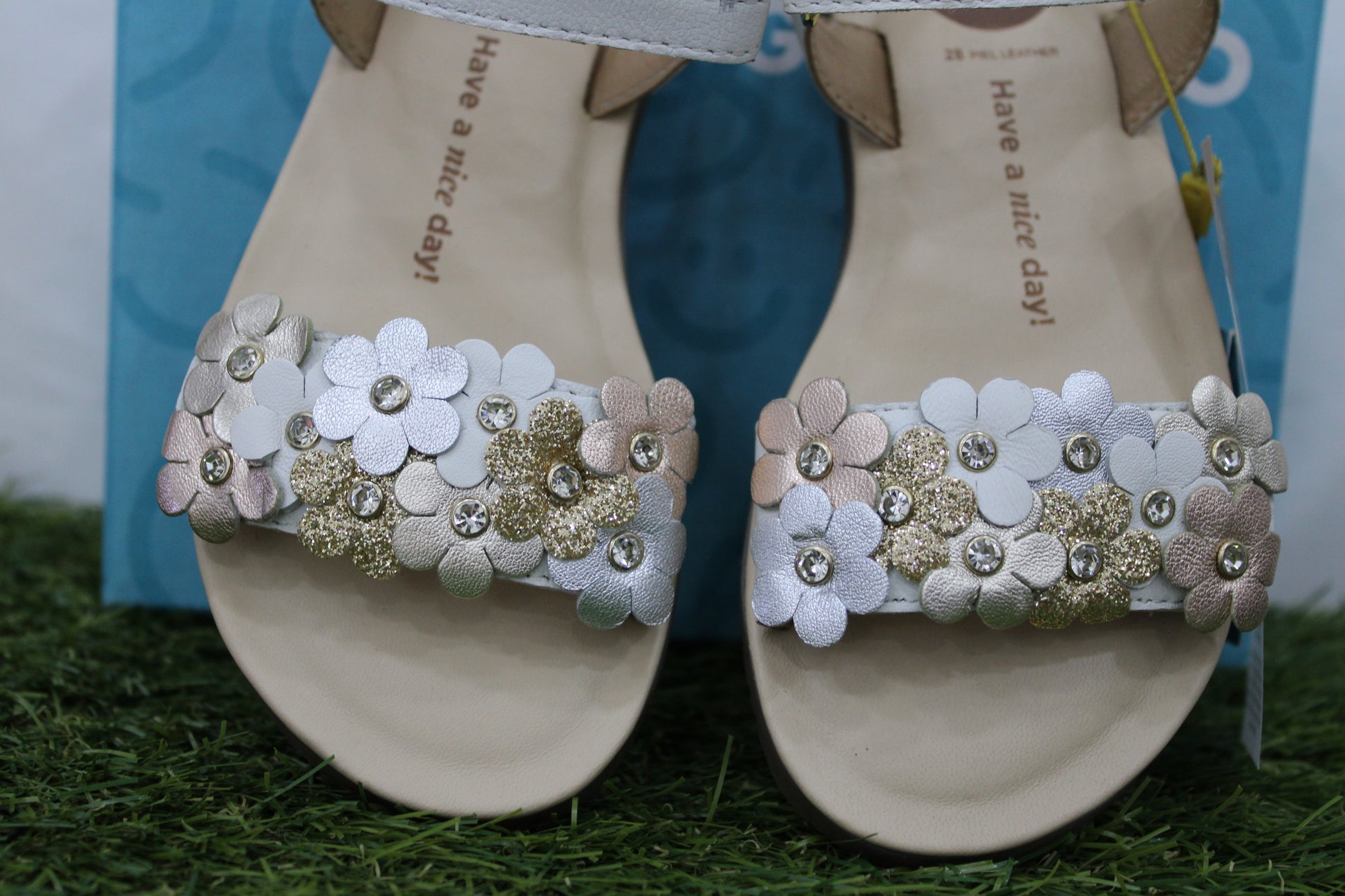 sandalo bianco, fascia con velcro impreziosita con fiori in argento, oro, cipria e rosa gold, chiusura alla caviglia con velcro