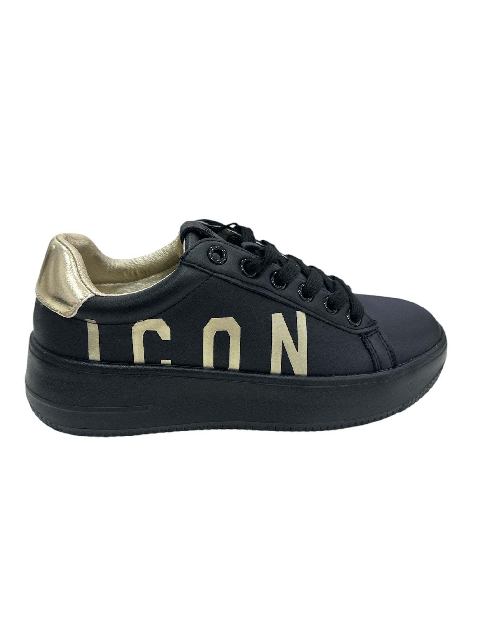 sneakers icon modello mcqueen , tomaia in pelle nera allacciata, logo laterale icon in oro e dettagli in oro