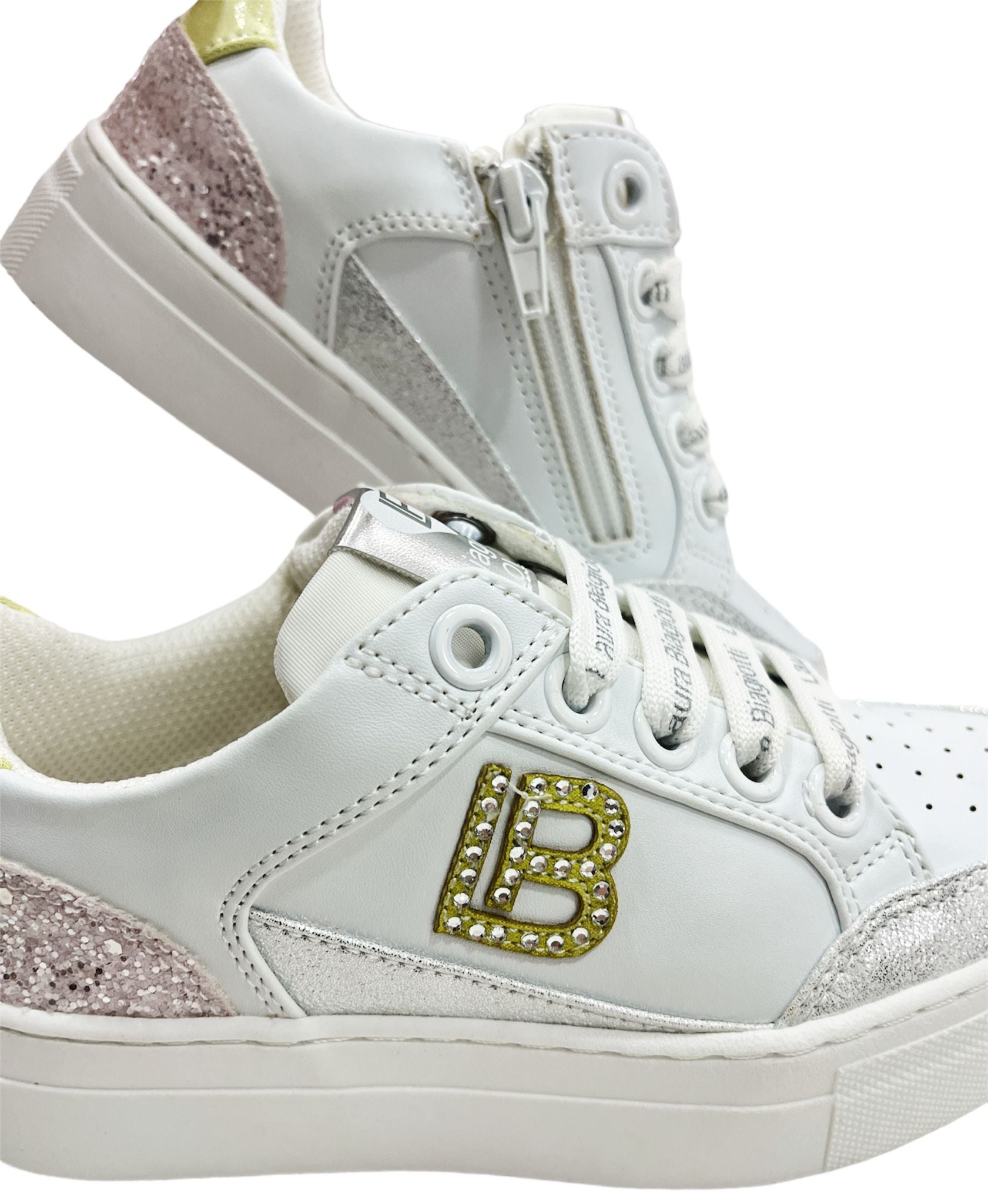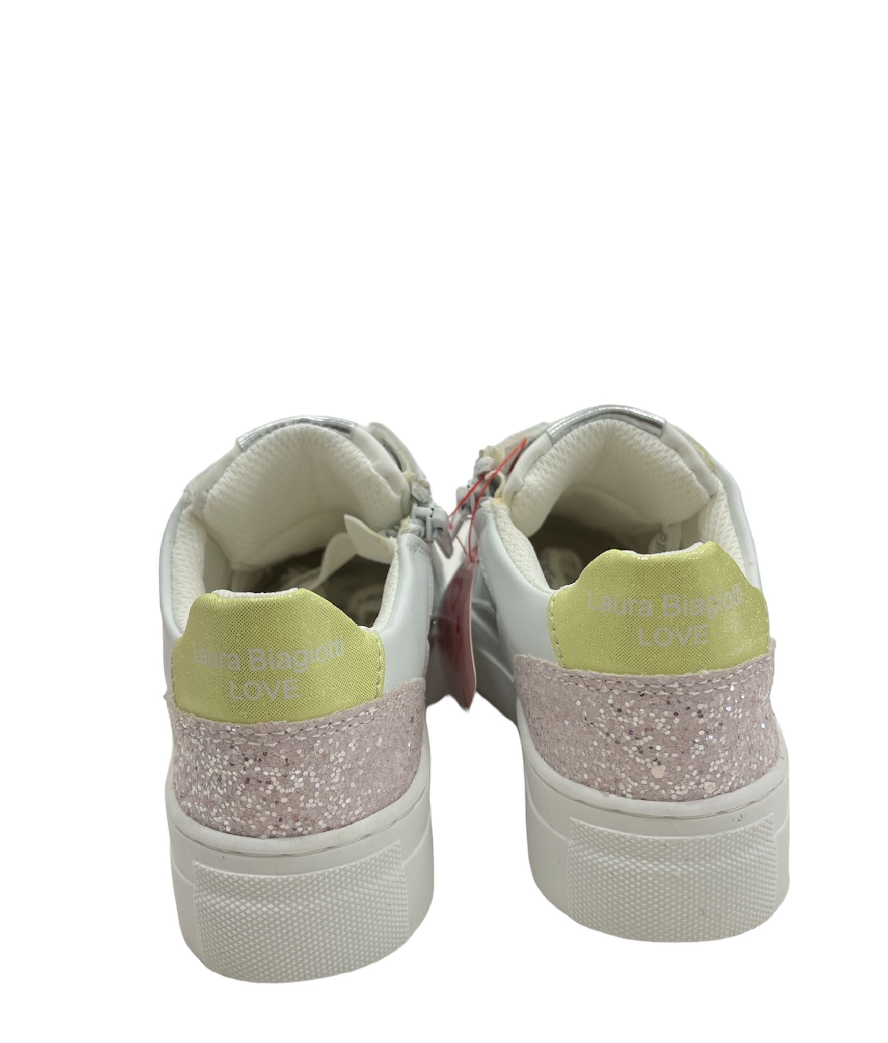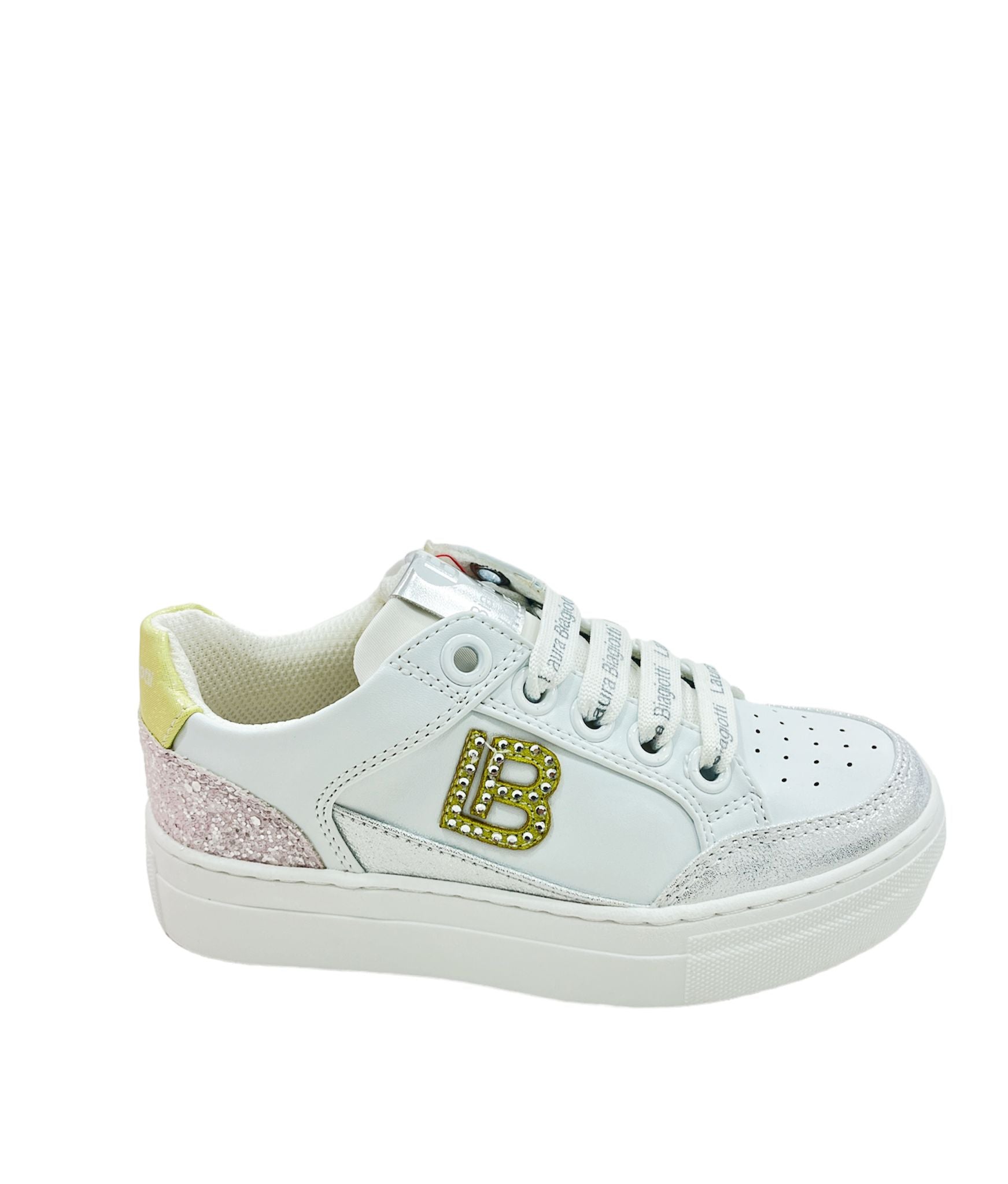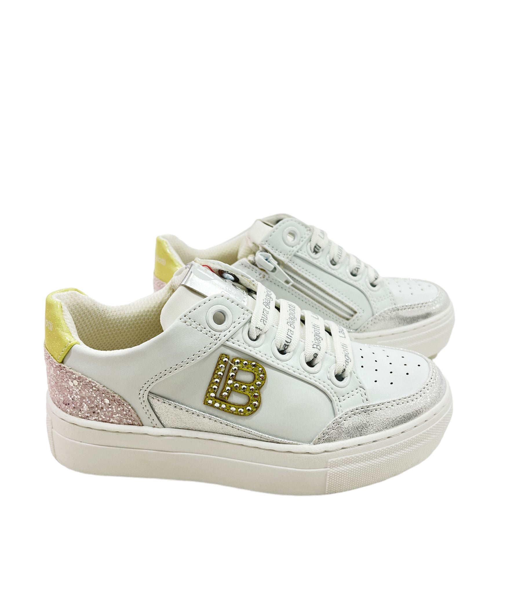 SNEAKER LAURA BIAGIOTTI, TOMAIA IN PELLE BIANCO CON TONI COLORATI GIALLO/ROSA ARGENTO. LOGO LB LATERALE IN STRASS. CHIUSURA STRINGATA LOGATA E ZIP LATERALE