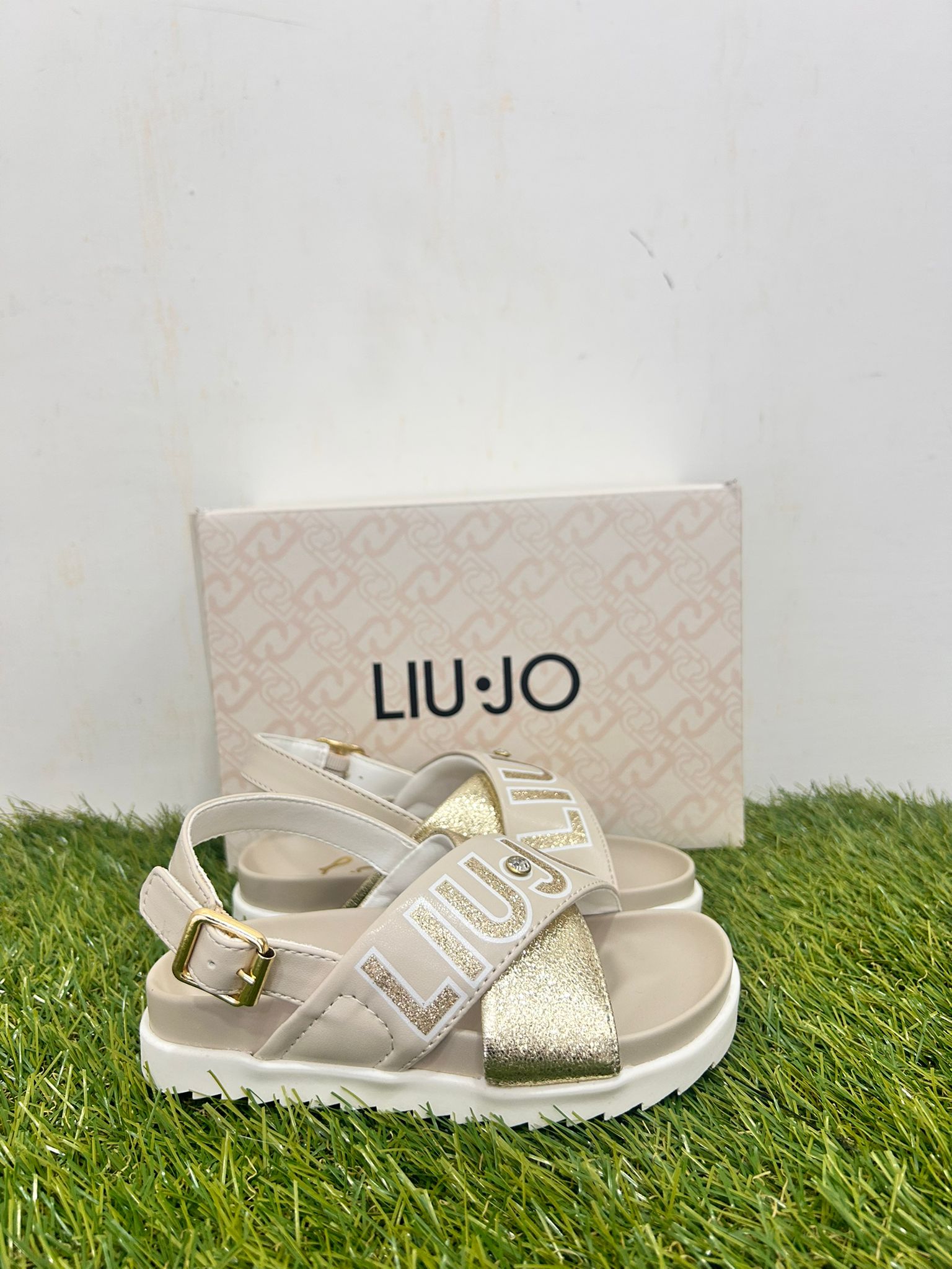sandalo modello mou, con fasce in beige e oro logato liu.jo e para alta