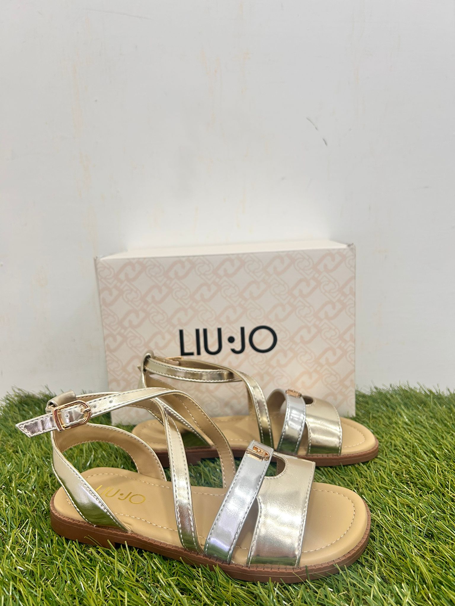 sandalo alla schiava in oro e argento, chiusura con cinturino