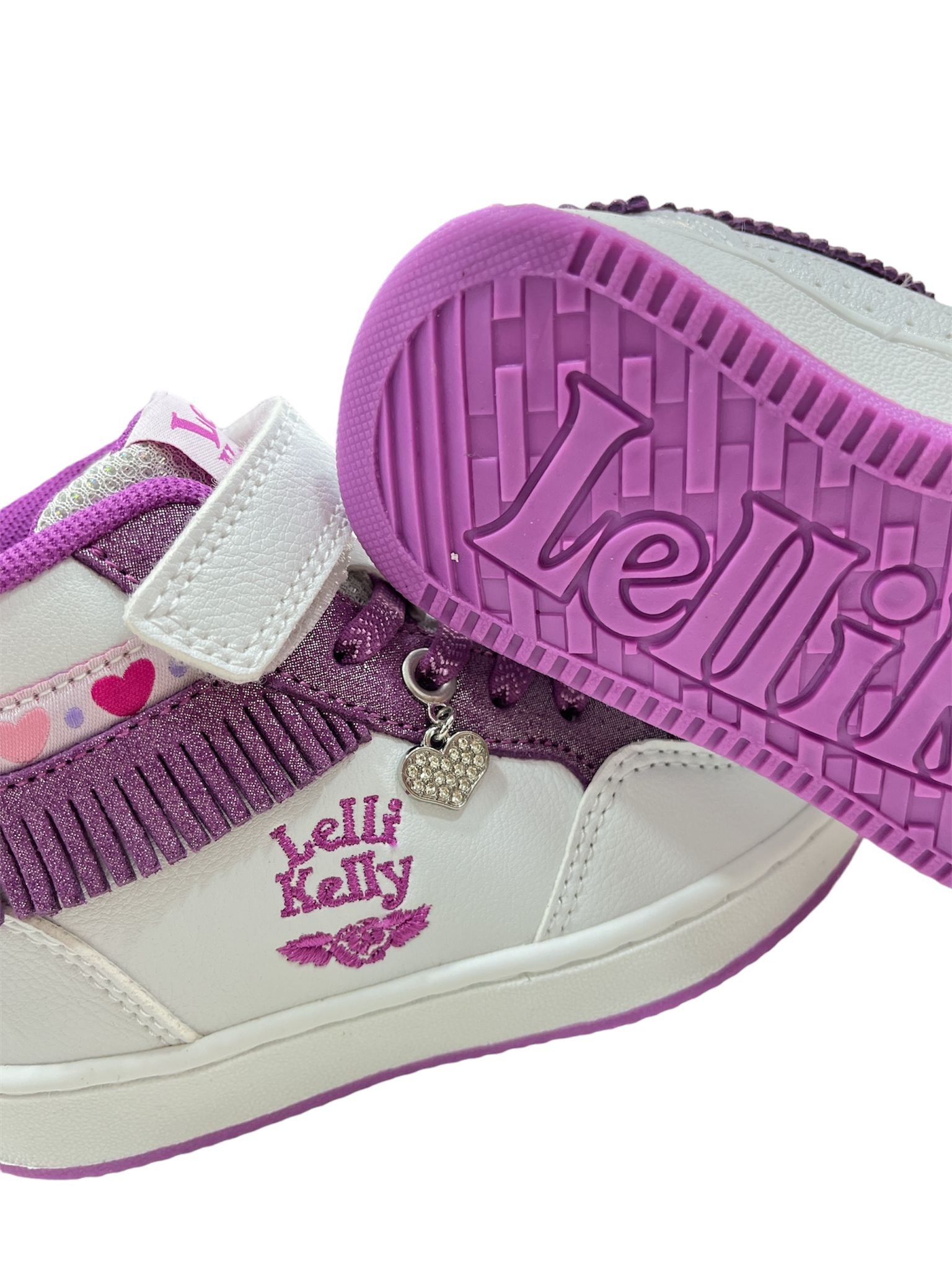 SNEAKER ALTA LELLI KELLI, TOMAIA IN PELLE BIANCA CON DETTAGLI IN PORPORA, CHIUSURA FINTO LACCIO E VELCRO