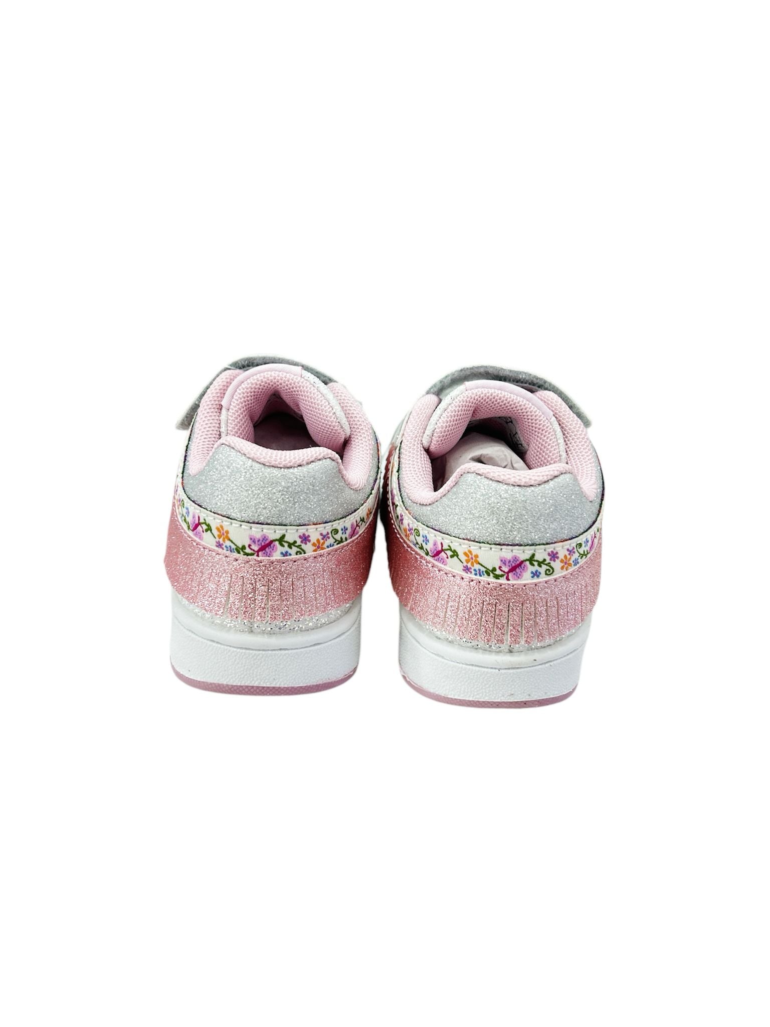 sneakers in pelle bianca e argento, frangetta sul retro in rosa, chiusura con finto laccio e velcro, gomma con luci, ciondolo mela per ricordare che sono create con buccia di mela