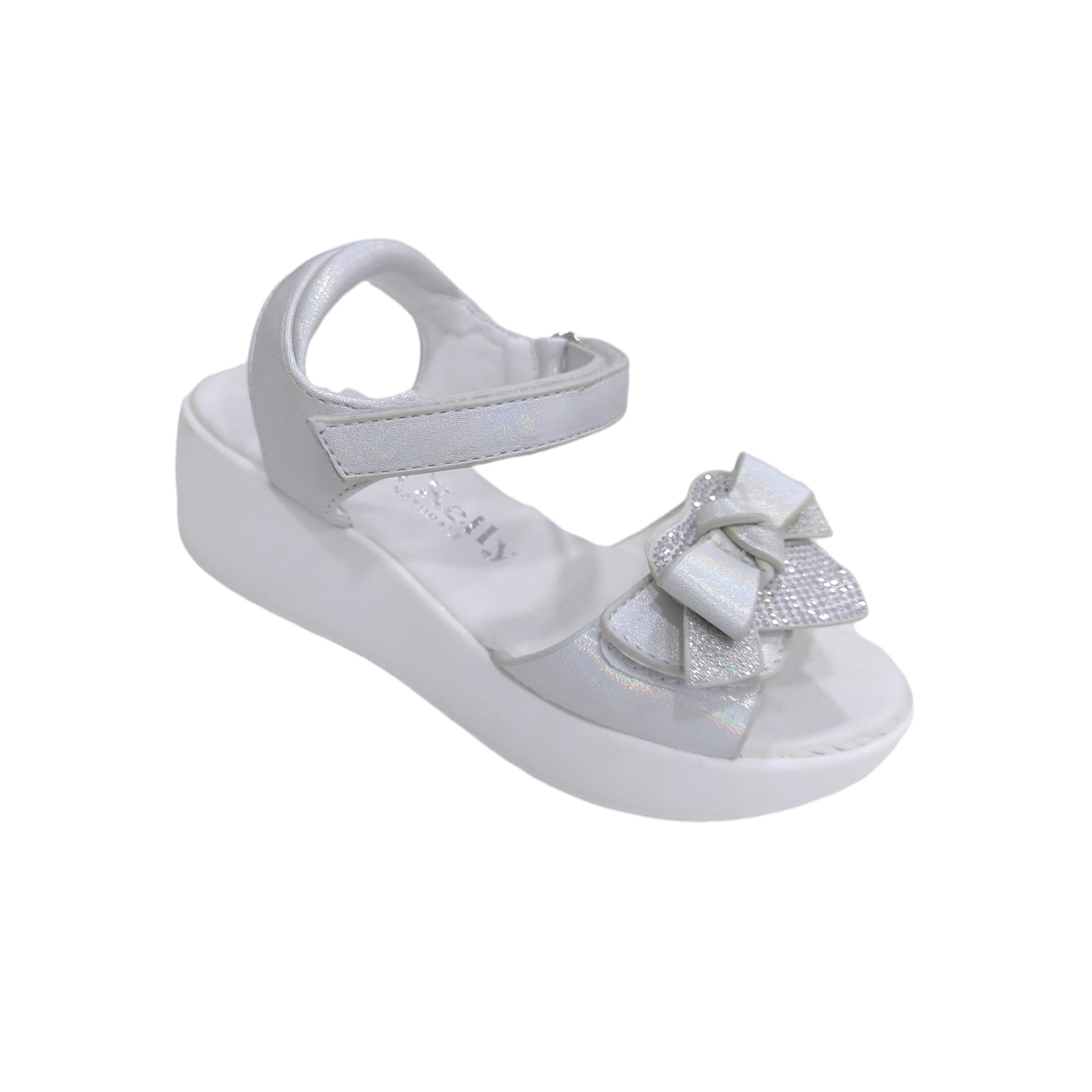 Sandali Giada Bambina, in ecopelle color bianco tinta unita, dettaglio anteriore applicazione di fiocco tinta su tinta con cuore in brillantini in contrasto, fondo in gomma antiscivolo e chiusura anteriore con strappo.
