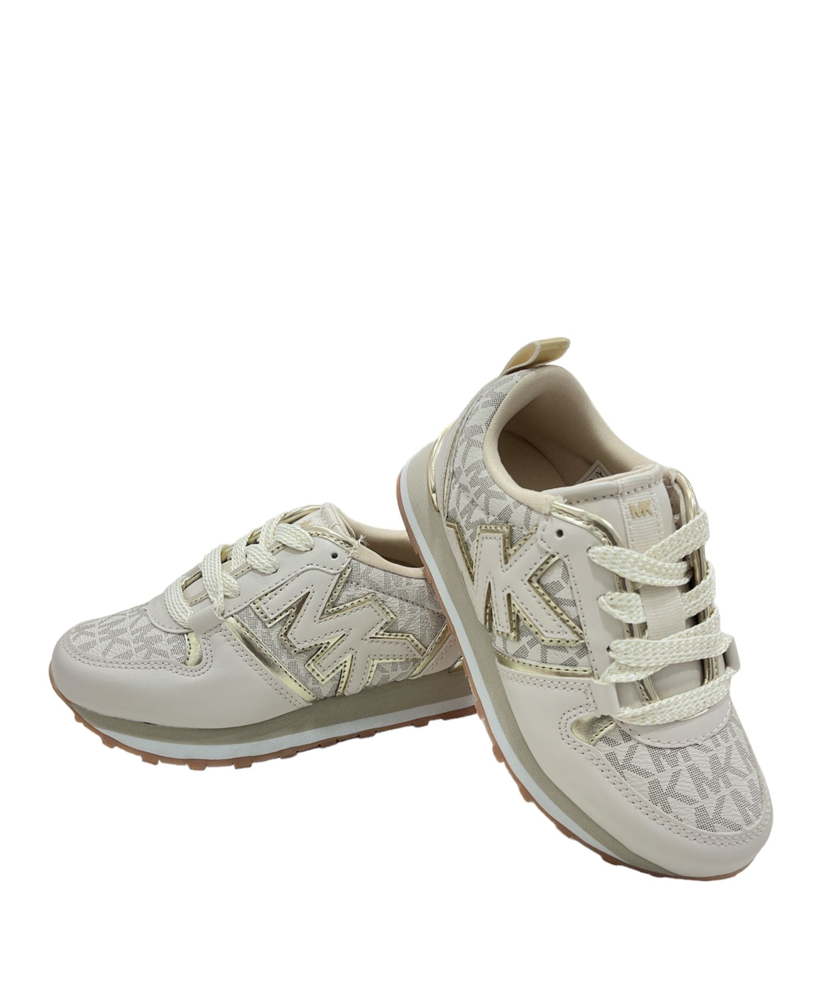 sneakers color vaniglia, tutta logata MK, chiusura con lacci panna glitterati, laterale logata MKr rialzato in panna e oro, linguetta logata MK, targhetta oro sul dietro logata michael kors, gomma rialzata in bianco e beige modello hogan