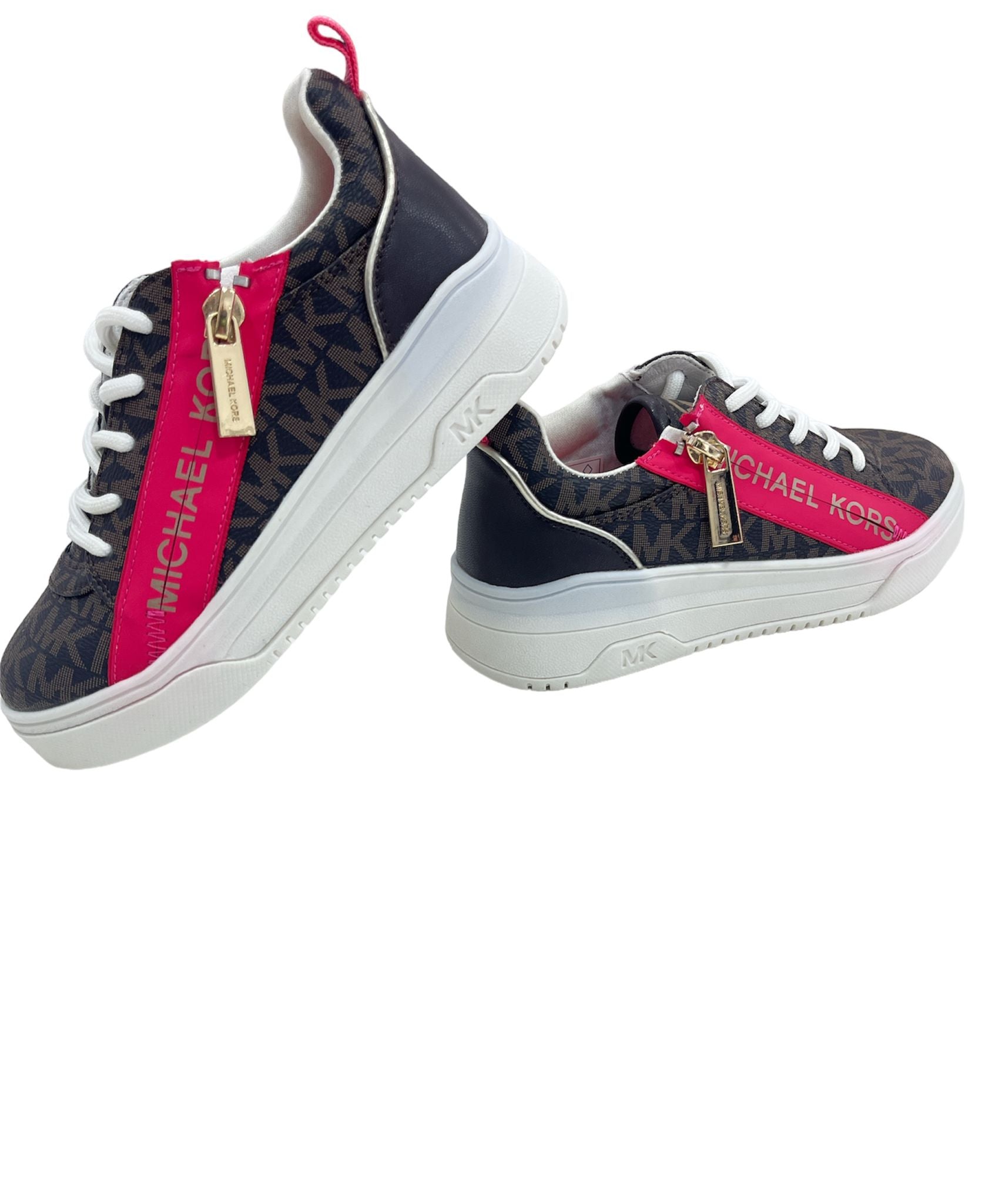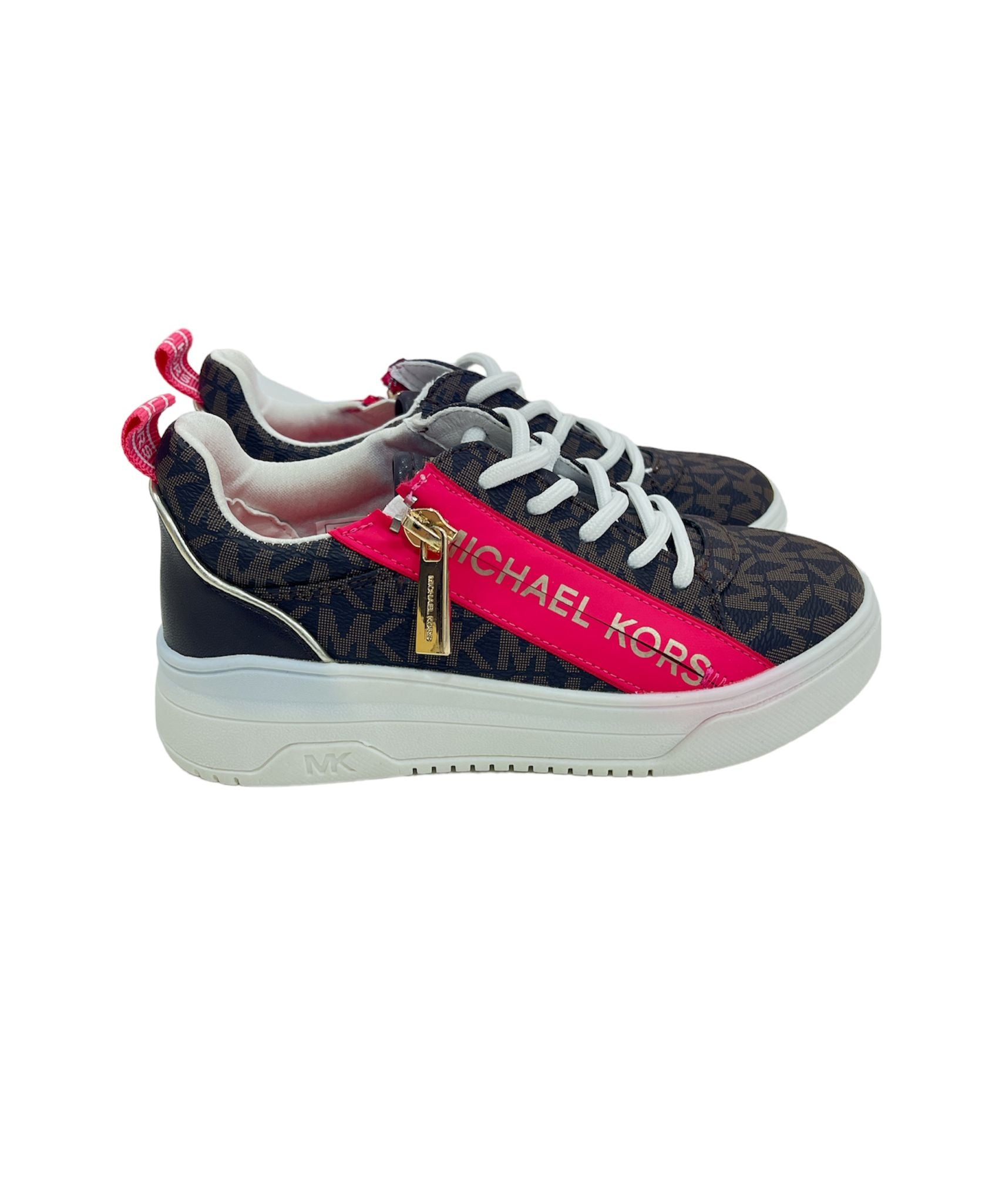 sneakers MK in marrone, tutta logata, con lacci e zip laterale in oro , gomma bianca particolare , linguetta sul dietro in rosa, e striscia rosa laterale con logo michael kors.