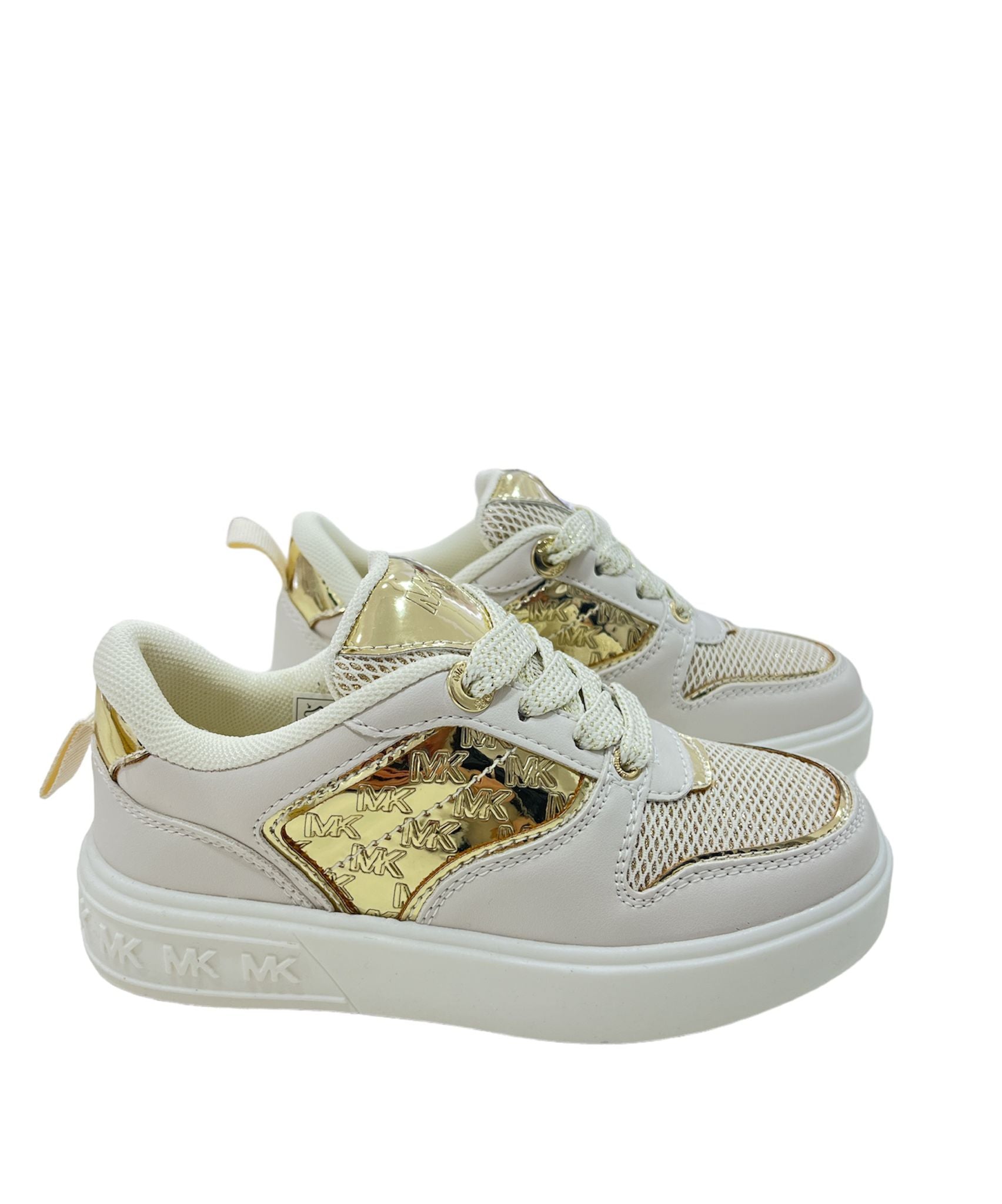 sneakers MICHAEL KORS con tomaia in pelle beige, logo in entrambi i lati MK in oro, sul retro particlarità in oro, sul davanti effetto bucherellato in glitter oro, chiusura con lacci in oro e bianco glitterati, linguetta in oro logata MK e gomma alta logata MK in bianco