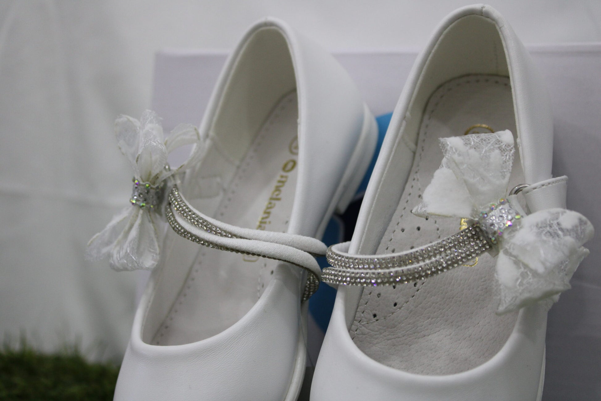 ballerina in pelle, chiusura co velcro, sulla caviglia presenta strass, e un fiocchetto