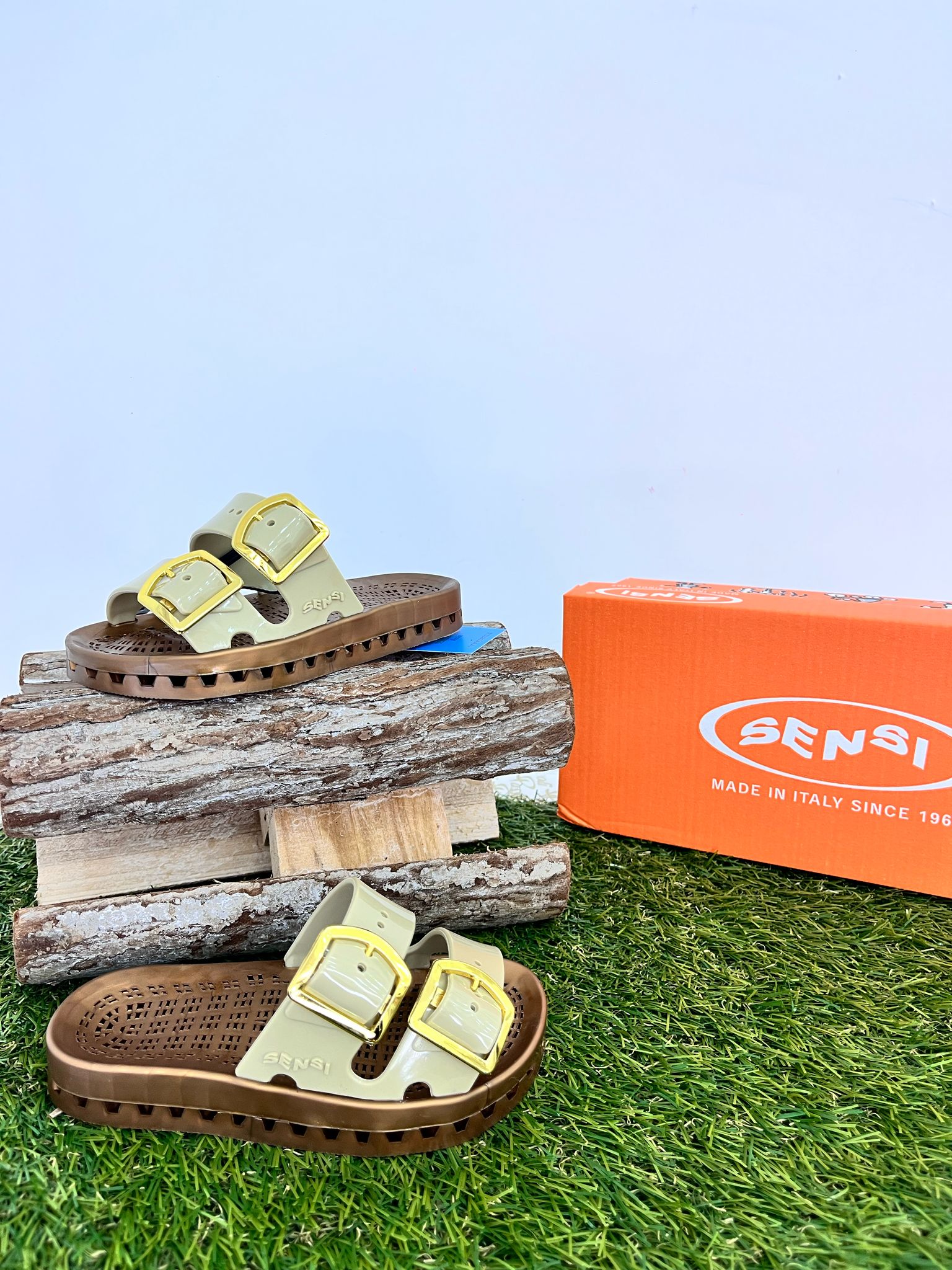 ciabatta con doppia fibbia beige traforata, regolabile e suola marrone con fori
