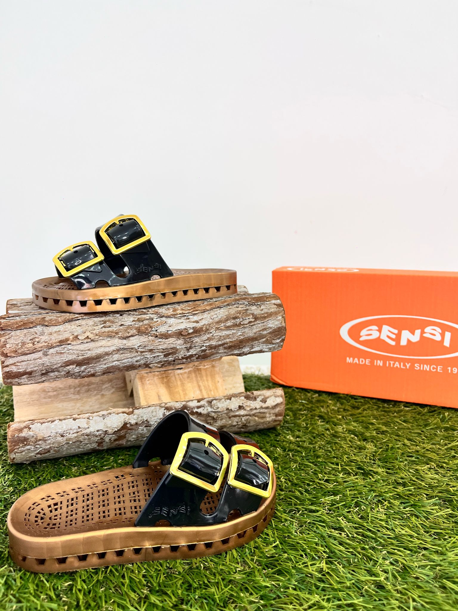 ciabatta con doppia fibbia nera traforata, regolabile e suola marrone con fori